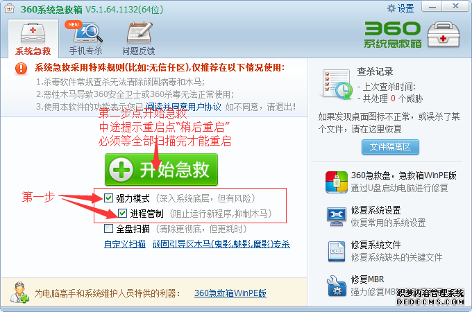 方法1:请用户 点此下载 360系统急救箱后运行,按如下图来处理。
